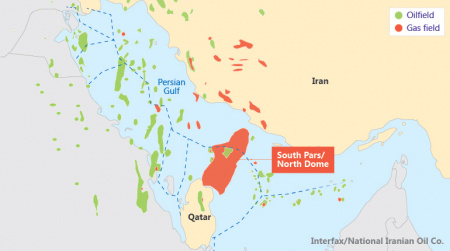 El yacimiento contiene unos 51 billones de metros cúbicos de gas recuperable que se reparten entre los 3.700 kilómetros cuadrados del South Pars iraní y los otros 6.000 que ocupa el North Field de Qatar